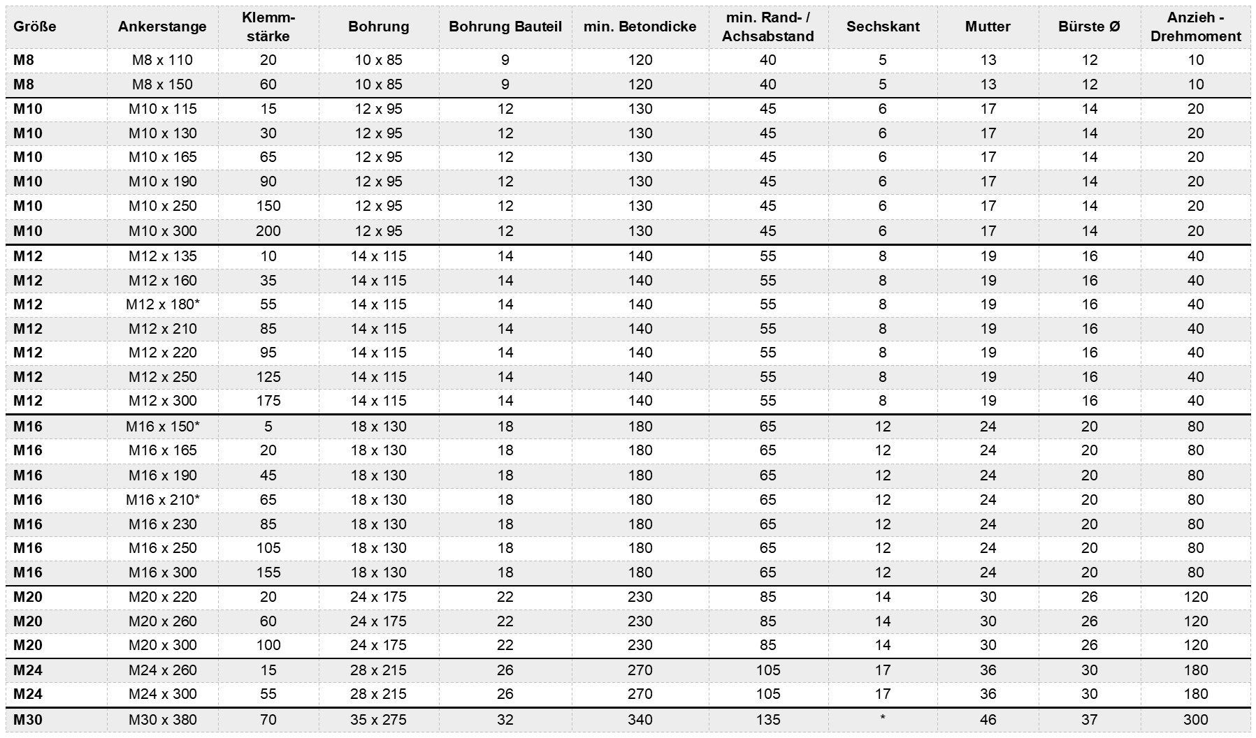 * Weitere Ankerstangenlängen und Klemmstärken für diese Größen vorhanden.