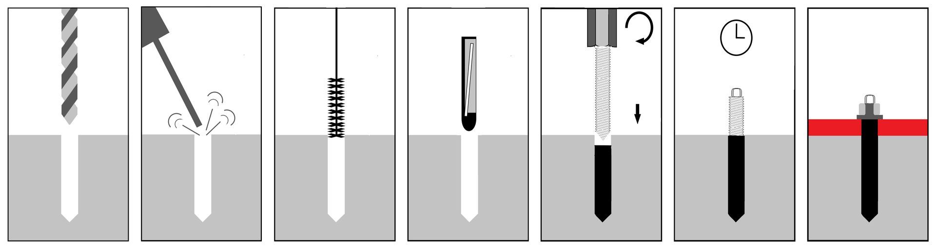 Tritt bei längerem Eindrehen oder nach Erreichen der Setztiefenmarkierung kein Mörtel aus dem Bohrloch, ist die Ankerstange sofort zu entfernen. Nach nochmaligem Reinigen kann mit einer neuen Patrone die Ankerstange eingedreht werden.
